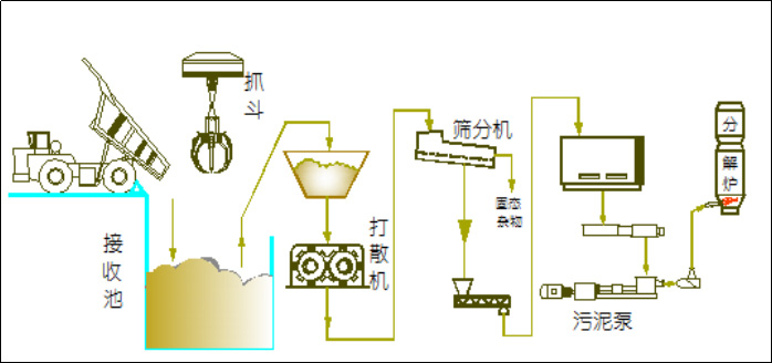半固態(tài)廢物配伍后,卸入半固態(tài)廢物接收坑,再由抓斗抓入打散機進行打散,打散后的物料經(jīng)篩分機將其中的固態(tài)雜物和大塊物料篩除,少量篩上物料另行處置。篩下物料(漿狀物料呈污泥狀)由螺旋輸送機輸送至污泥倉。倉內(nèi)漿狀物料由膏體泵輸送至窯尾高溫焚燒,系統(tǒng)配置除雜器,入窯口配置污泥噴槍。